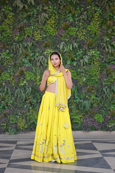 Elevate your style with our Bright Yellow Sparkle Embellished Lehenga. Made with intricate detailing and adorned with dazzling sparkles, this piece is sure to make a statement. Perfect for any special occasion, this lehenga will add a touch of elegance and sparkle to your wardrobe.
