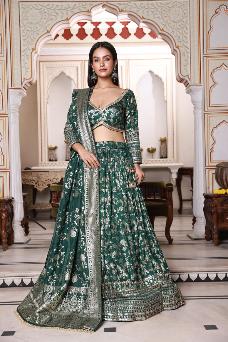 This Dark Green Embroidered Silk Lehenga includes a silk top with satin silk inner, silk bottom with satin silk inner. Embroidery is incorporated into the lehenga using faux zari, sequins, and beads work.