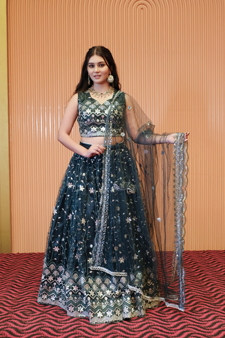 This Dark Teal Sparkle Embroidered Net Lehenga is an exquisite piece with intricate embroidery and delicate embellishments. Made with high-quality materials, it is perfect for any special occasion. The detailed craftsmanship and attention to detail make it a must-have for any fashion-forward individual.
