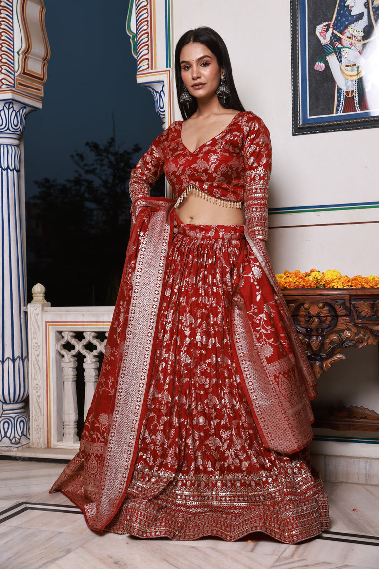 This Deep Red Embroidered Silk Lehenga includes a silk top with satin silk inner, silk bottom with satin silk inner. Embroidery is incorporated into the lehenga using faux zari, sequins, and beads work.