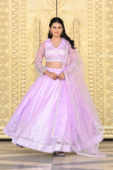This Lavender Pink Sparkle Embroidered Net Lehenga is a stunning addition to any wardrobe. The intricate embroidery on soft net fabric adds a touch of elegance and the delicate lavender pink hue is perfect for any occasion. Made with expert craftsmanship, this lehenga is sure to make a statement with its effortless beauty.