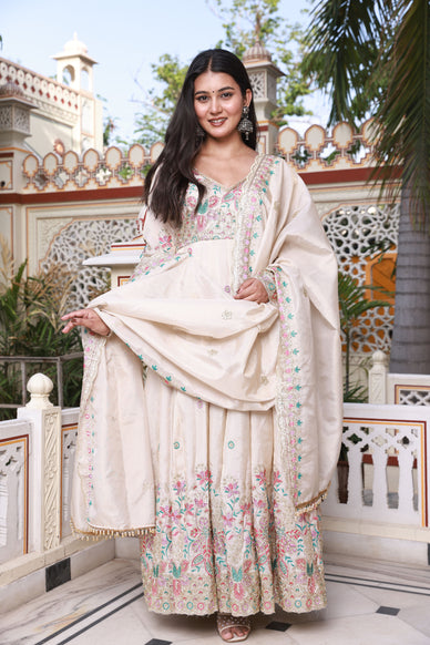 This Light Beige Floral Hand-Work Crepe Silk Gown includes a crepe silk gown with satin silk inner, and a crepe silk dupatta. Embroidery is incorporated into the gown using faux zari, sequins, resham, gota patti, beads, and mirror work.