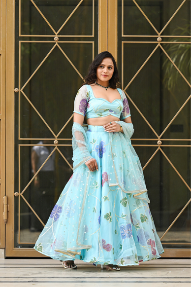 Experience the beauty of nature with our Light Blue Multicolor Floral Embroidered Organza Lehenga! Delicately crafted with intricate floral embroidery, this lehenga is perfect for any special occasion. Made with lightweight and breezy organza fabric, it will make you feel like a princess while keeping you comfortable all day. Add a touch of elegance and grace to your wardrobe with this stunning lehenga.