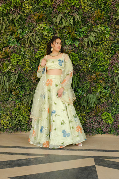 Designed to impress, this Light Green Multicolor Floral Embroidered Organza Lehenga & Detachable Sleeves combines vibrant floral embroidery with a soft, elegant light green fabric. The intricate embroidery enhances its beauty, while the detachable sleeves offer a customizable, contemporary touch. Perfect for weddings, festivals, or any special event, this lehenga provides both traditional charm and modern versatility, ensuring you stand out with grace and style.
