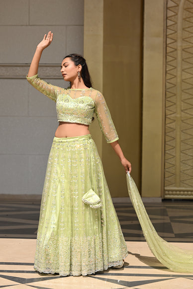 This Light Pastel Green Sparkle Embroidered Net Lehenga features delicate embroidery on high-quality net fabric, perfect for special occasions. Its soft pastel green hue adds a touch of elegance, while the flowing silhouette provides comfort and movement. Enhance your traditional ensemble with this beautiful and versatile lehenga.