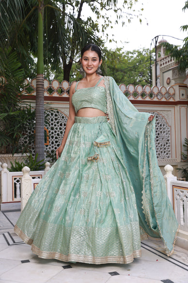 This Mint Green Embroidered Raw Silk Lehenga includes a raw silk top with satin silk inner, raw silk bottom with satin silk inner, and a silk dupatta. Embroidery is incorporated into the lehenga using faux zari, sequins, and beads work.