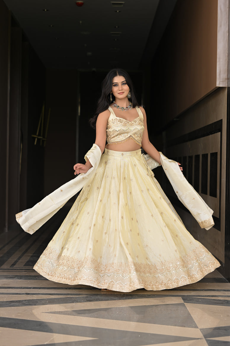 This Off-White and Beige Embroidered Silk Lehenga is an elegant and luxurious piece that is perfect for any special occasion. Crafted with high-quality silk, the intricate embroidery adds a touch of sophistication and glamour. With its timeless design, this lehenga is sure to make you stand out in any event.
