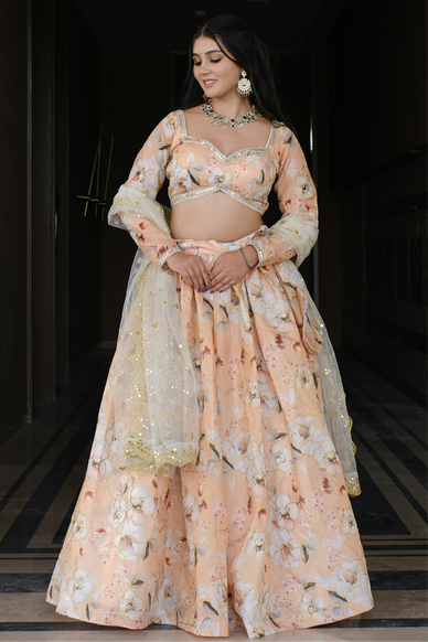This luxurious Peach Floral Embroidered Silk Lehenga is the perfect blend of elegance and sophistication. Made with high-quality silk material and intricately embroidered with beautiful floral patterns, it exudes a sense of opulence. The lightweight fabric ensures comfort while the intricate embroidery adds a touch of glamour. Elevate your style and make a statement with this beautiful lehenga.