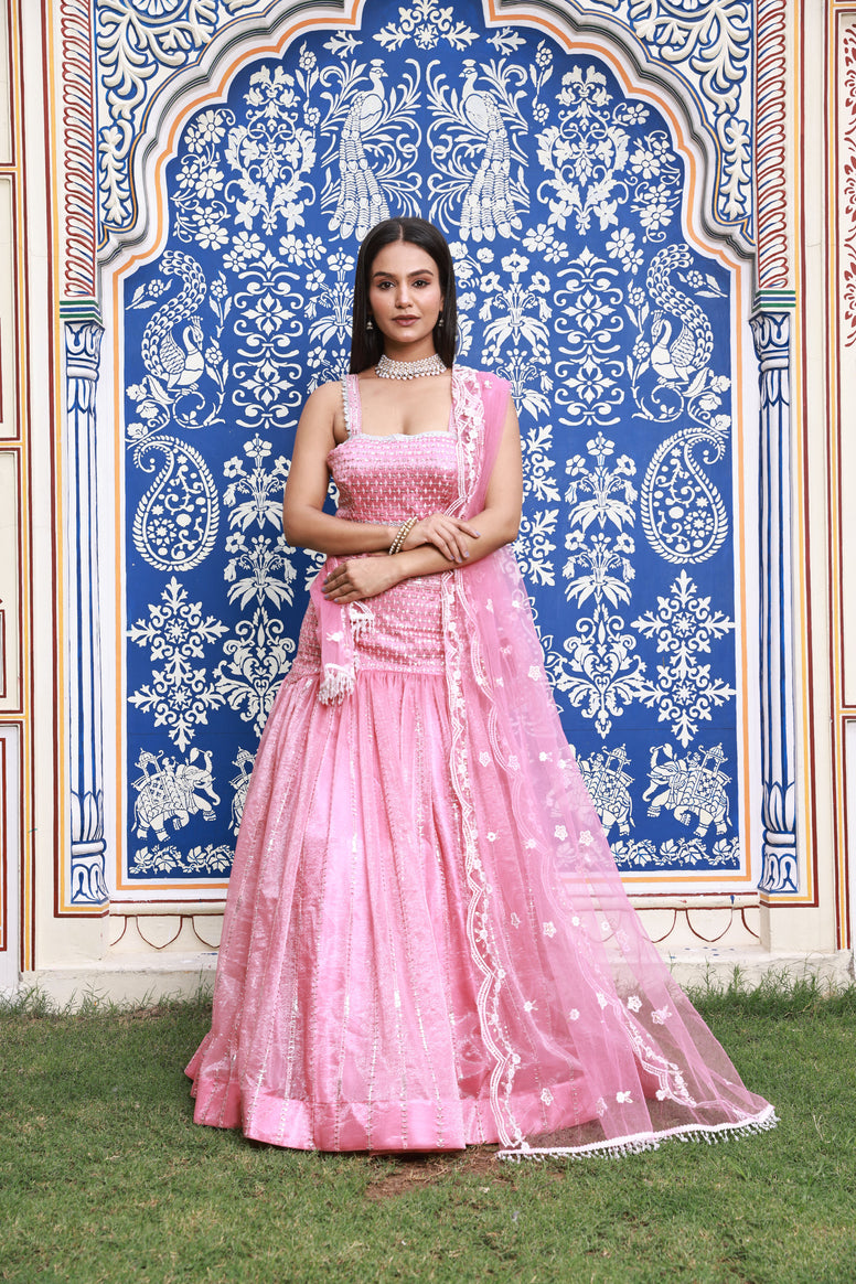This Pink Trumpet-Style Hand-Work Silk Lehenga includes a silk top with satin silk inner, tulle bottom with satin silk inner, and a tulle dupatta. Embroidery is incorporated into the lehenga using faux zari, sequins, and beads work.