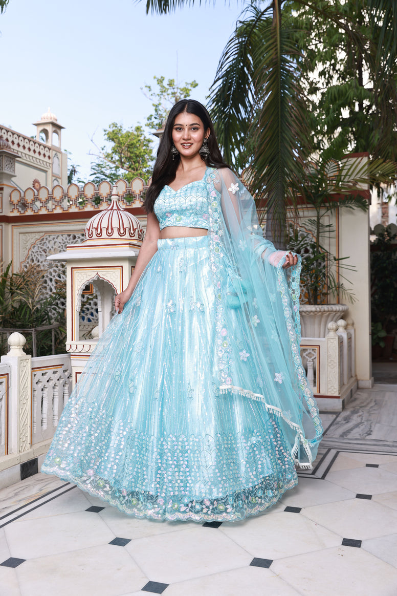 This Sky Blue Embroidered Net Lehenga includes a net top with satin silk inner, net bottom with satin silk inner, and a net dupatta. Embroidery is incorporated into the lehenga using faux zari and sequins work.