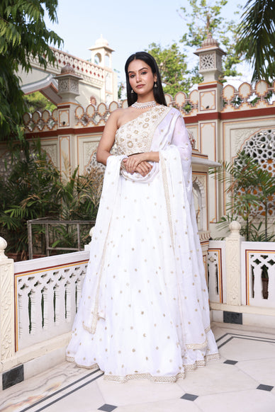 This White and Beige Hand-Work One Shoulder Georgette Lehenga includes a silk top with satin silk inner, georgette bottom with satin silk inner, and a georgette dupatta. Embroidery is incorporated into the lehenga using sequins and beads work.